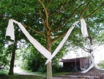 Der Stoff ist robust, verträgt die Spuren von Wetter, Vögeln, Bäumen. Die Installation ist flexibel – wieder abgenommen wird der Stoff mit jedem Waschen heller und weicher!